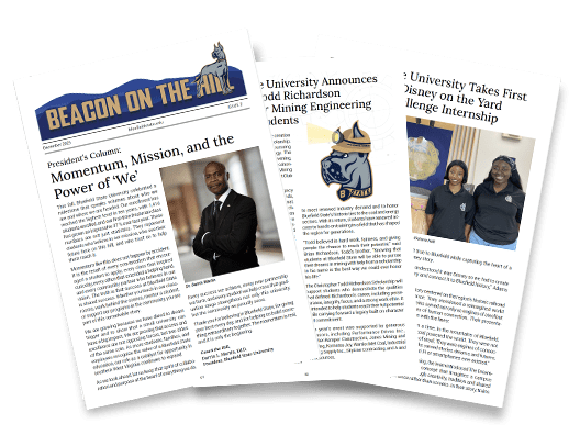 Beacon on the Hill Beacon on the Hill serves to inform, inspire, and connect B-State Family with the ongoing achievements and vision of Bluefield State University. Read Now Download Copy Breaking Blues Featuring success stories about Bluefield State Students and Alumni! Read Now Download Copy Read Previous Issues Fall 2024Read Now TweetShareShare